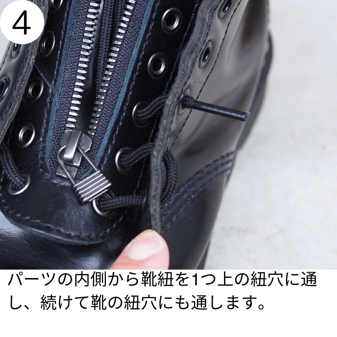 以下の2枚の画像のようにカスタムジップパーツに靴紐を通します。