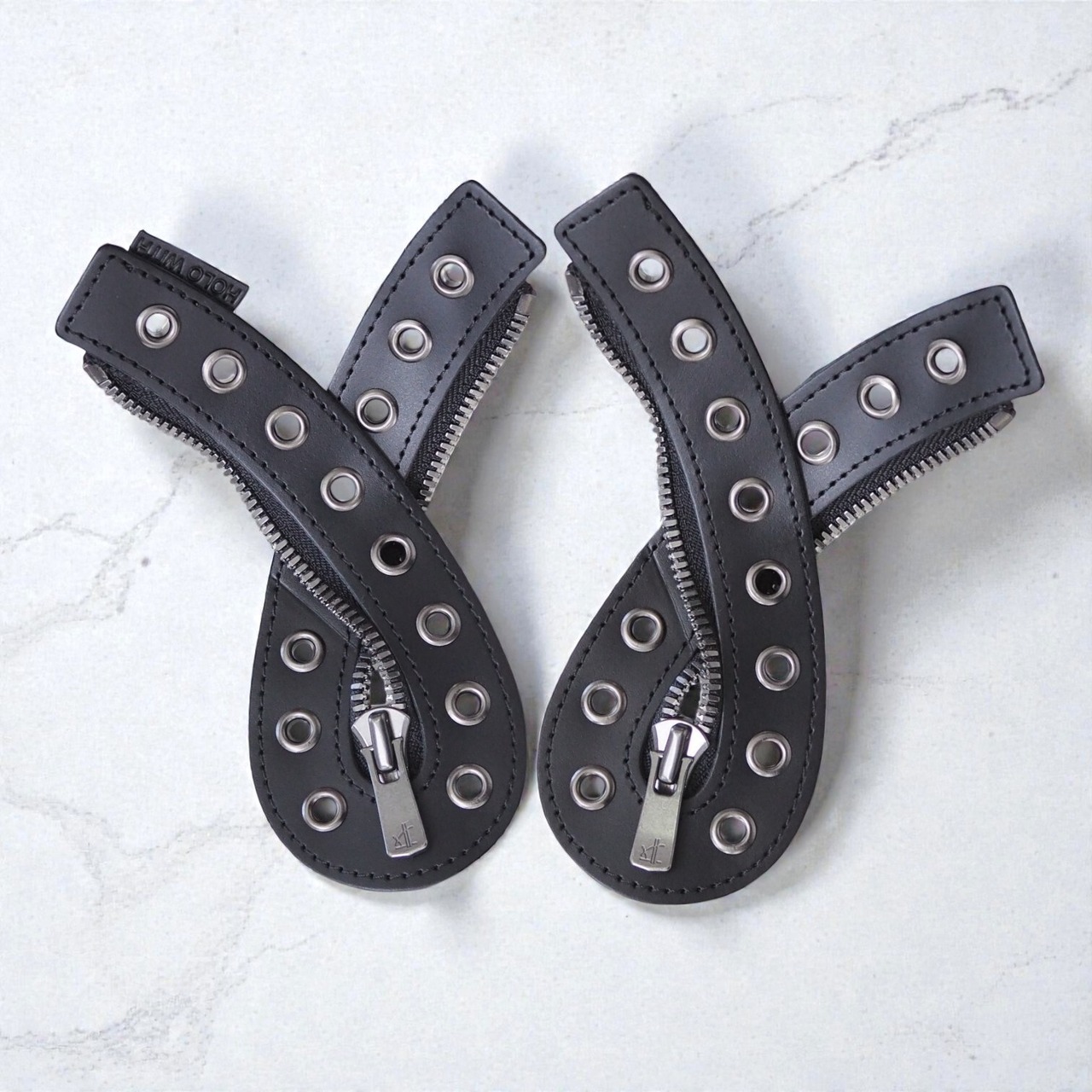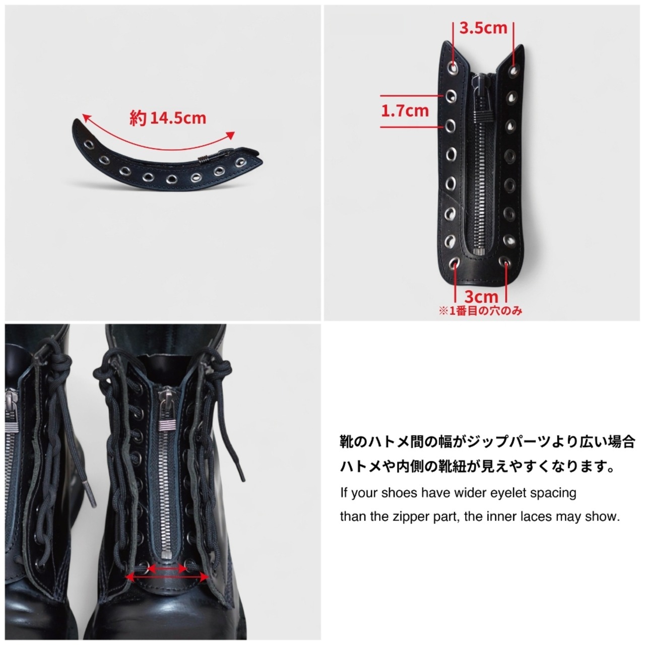 靴紐をこのパーツに通すだけで靴紐をほどいたり結んだりする手間が省け、脱ぎ履きが楽になります。ご自身の手でお手持ちのレースアップタイプの8ホールブーツをジップアップタイプにカスタムすることができます。パーツは靴紐で靴本体に結びつけるだけなので、気分によって着脱可能です。